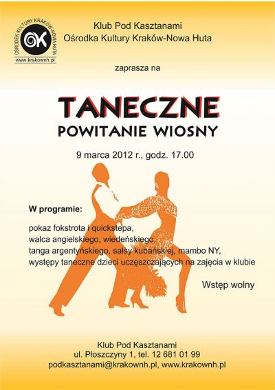 Klub Pod Kasztanami Oœrodka Kultury Kraków-Nowa Huta (ul. Płoszczyny 1) zaprasza 9 marca 2012 r. (pištek) o godz. 17.00 na imprezę tanecznš z okazji zbliżajšcej się wiosny.