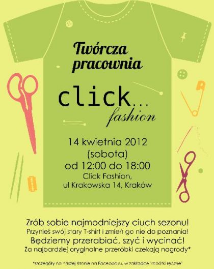 14 kwietnia sklep Click Fashion zamieni się w Twórczš Pracownię! WeŸ rzeczy, które już Ci się znudziły, zaproœ koleżanki i puœćcie wodze fantazji. Na miejscu będš czekać na Was igły, nici, guziki, tasiemki i skrawki materiałów.