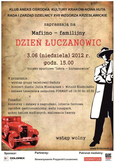 Klub Aneks Oœrodka Kultury Kraków-Nowa Huta oraz Rada i Zarzšd Dzielnicy XVII Wzgórza Krzesławickie zapraszajš mieszkańców Łuczanowic oraz innych krakowskich osiedli na rodzinna imprezę plenerowš. W programie festynu, który przeniesie uczestników w klimat lat 20-tych, znajdzie się między innymi koncert Julii Miesišczek i Witolda Niedojadło - półfinalistów programu Must be the music. Tylko muzyka, występ zespołu baletowego Gaduły czy Formacji Aneks. W tematykę imprezy przybyłych wprowadzš specjalnie przygotowane konkursy – m.in. na najlepszy list gończy, portret gangstera, z wiedzy o najsłynniejszych agentach wszech czasów.