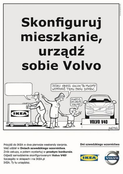 Samochód ten jest też nagrodš w konkursie głównym. Specjalnie na Dni szwedzkiego wzornictwa Andrzej Mleczko przygotował rysunek, który należy w zabawny i kreatywny sposób uzupełnić. Na autorów najlepszych pomysłów czeka samochód VOLVO V40 oraz karty upominkowe IKEA o wartoci 7 500 zł i 5 000 zł. Zwycięzców wyłoni jury pod przewodnictwem mistrza satyrycznej kreski.