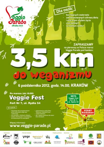 W ramach Veggie Parade w Krakowie, 6-ego padziernika, organizatorzy planujš masowy marsz z transparentami, skandowaniem haseł, rozdawaniem ulotek, instrumentami ulicznymi (tzw. samba), muzykš z sound systemu, tall-bikeami i innymi widowiskowymi elementami. Ruszymy spod Barbakanu na Rynek Główny, gdzie odczytamy manifest w języku polskim i angielskim, a następnie ulicš Karmelickš i Królewskš pójdziemy w kierunku Fortu Nr 7 (ul. Rydla) - na zakończenie Parady w postaci veggie festynu.